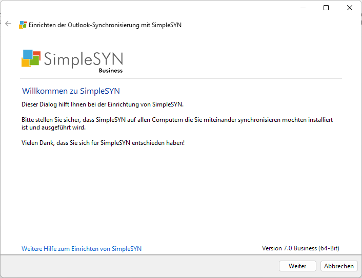 Klicken Sie auf „Weiter“, um mit der Einrichtung von SimpleSYN zu beginnen.