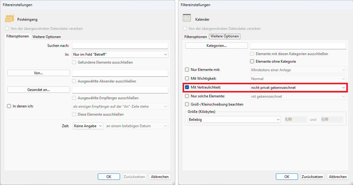 Folgende Optionen stehen Ihnen zur Filterung eines Outlook®-Ordners oder eines Datenspeichers zur Verfügung: