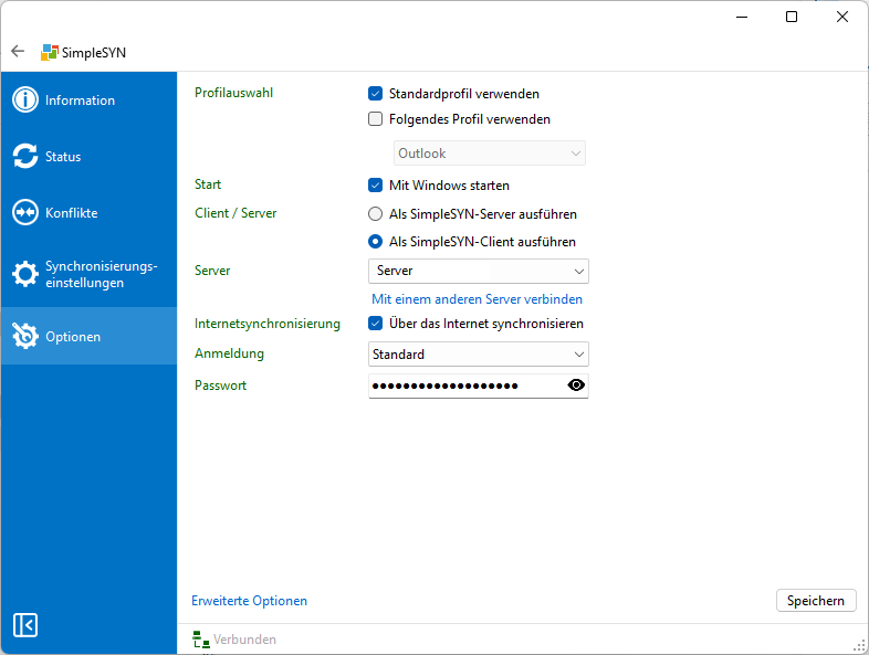In der Dropdownliste „Anmeldung“ können Sie die Art der Authentifizierung für SimpleSYN festlegen. Wählen Sie den Anmeldetyp, den Sie auch auf dem SimpleSYN-Server konfiguriert haben. In der Standardeinstellung verwendet SimpleSYN den Typ „Standard“, bei dem die Einstellungen für alle SimpleSYN-Clients identisch sind