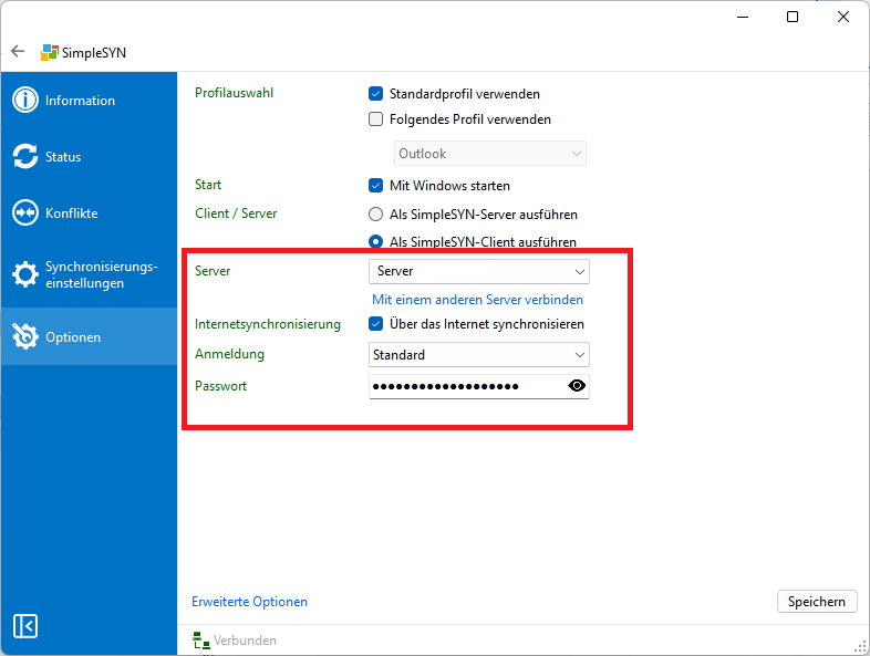 Mit diesen Informationen kann der SimpleSYN-Client eine Verbindung zum Server herstellen und die Synchronisation starten.