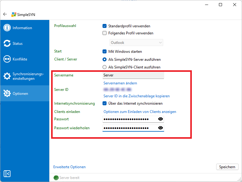 Wenn Sie das Optionsfeld „Als SimpleSYN-Server ausführen“ ausgewählt haben, wird SimpleSYN auf diesem Computer als Server ausgeführt. Der Server übernimmt die zentrale Rolle im Synchronisationsnetzwerk und verteilt die Daten an alle verbundenen Clients.