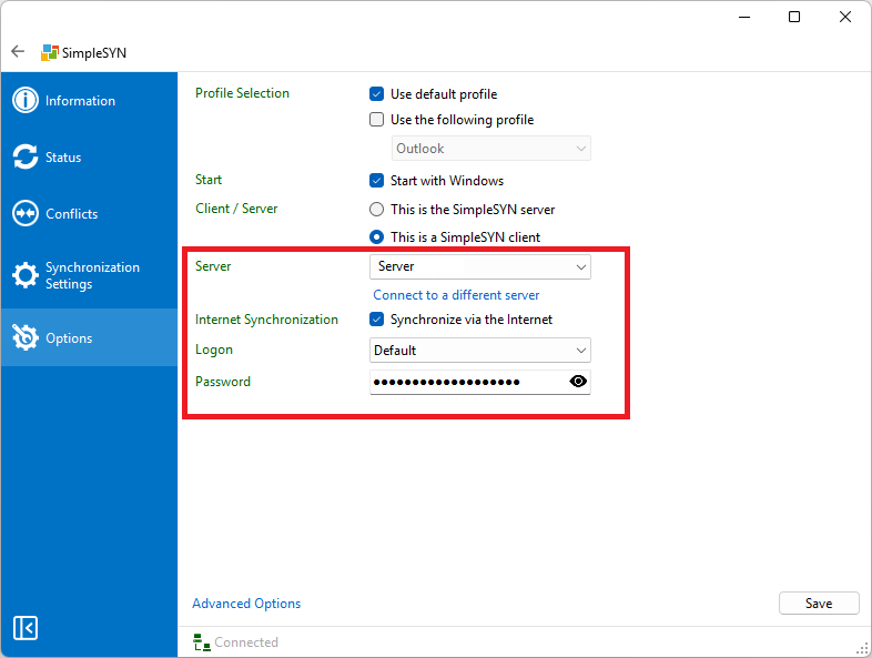 In the “Logon” dropdown list, you can define the type of authentication for SimpleSYN. Select the login type that you have also configured on the SimpleSYN server. By default, SimpleSYN uses the “Default” type, where the settings are identical for all SimpleSYN clients.